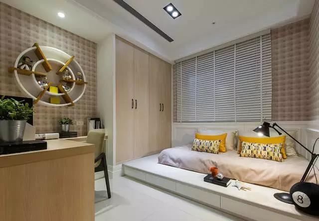 在卧室打造一个榻榻米,既能做床,也能做成一个休闲角落,深色地台搭配浅色墙面,原木色家居的点缀,使整个卧室简单却不失特色。